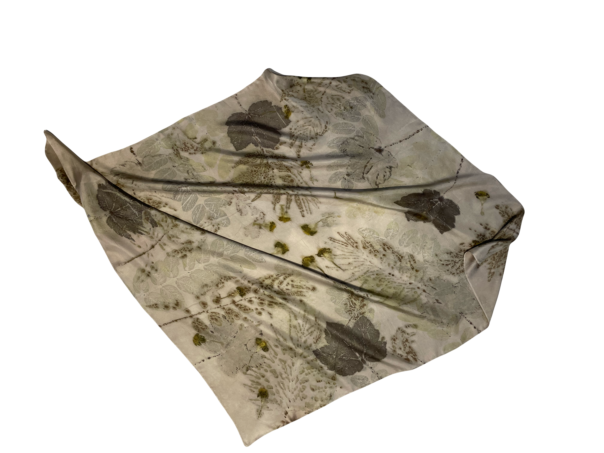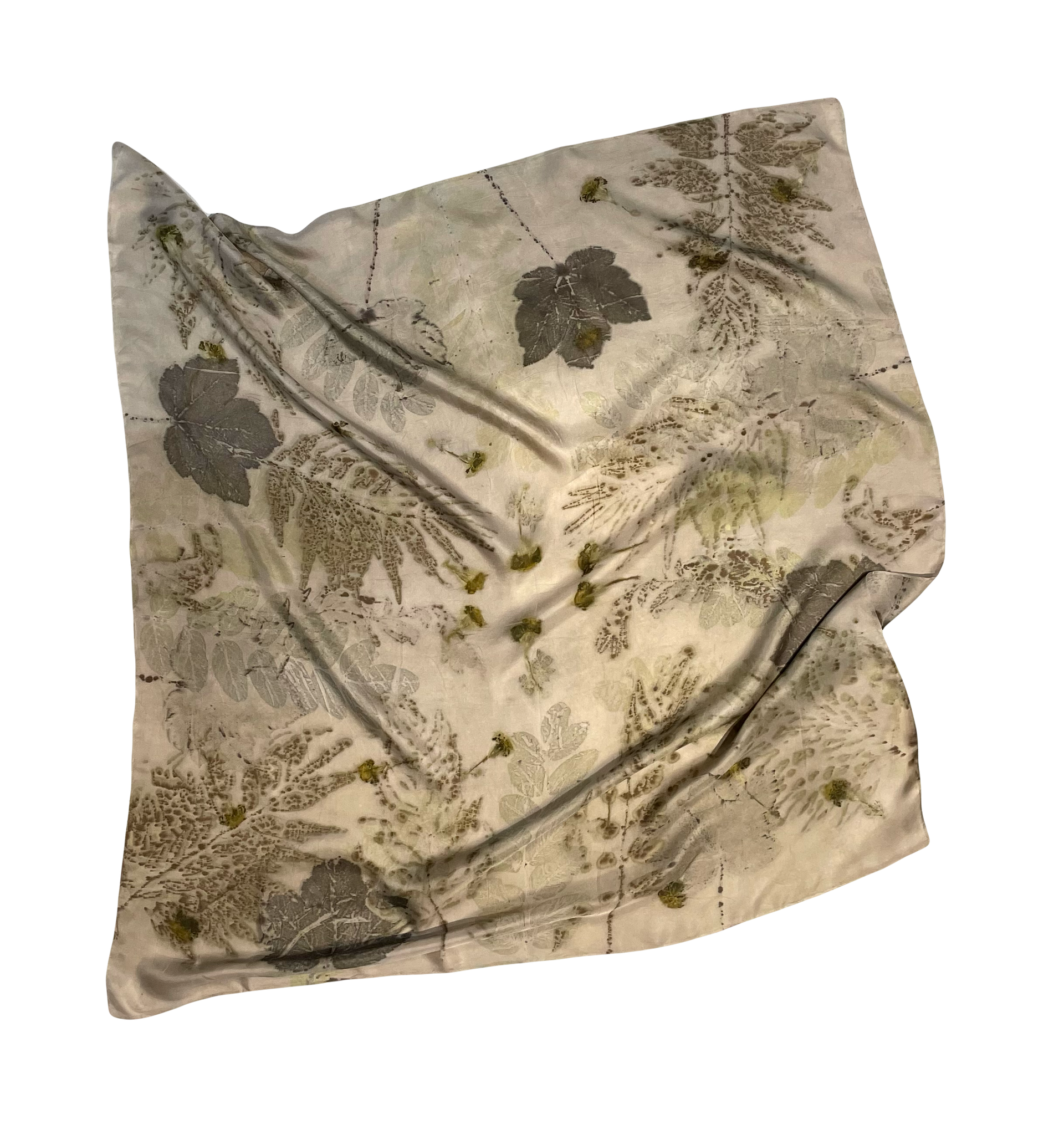 Pañuelo de seda natural con estampación botánica de hojas de grevillea, arce blanco y tagetes. Fondo teñido con tintes botánicos.
