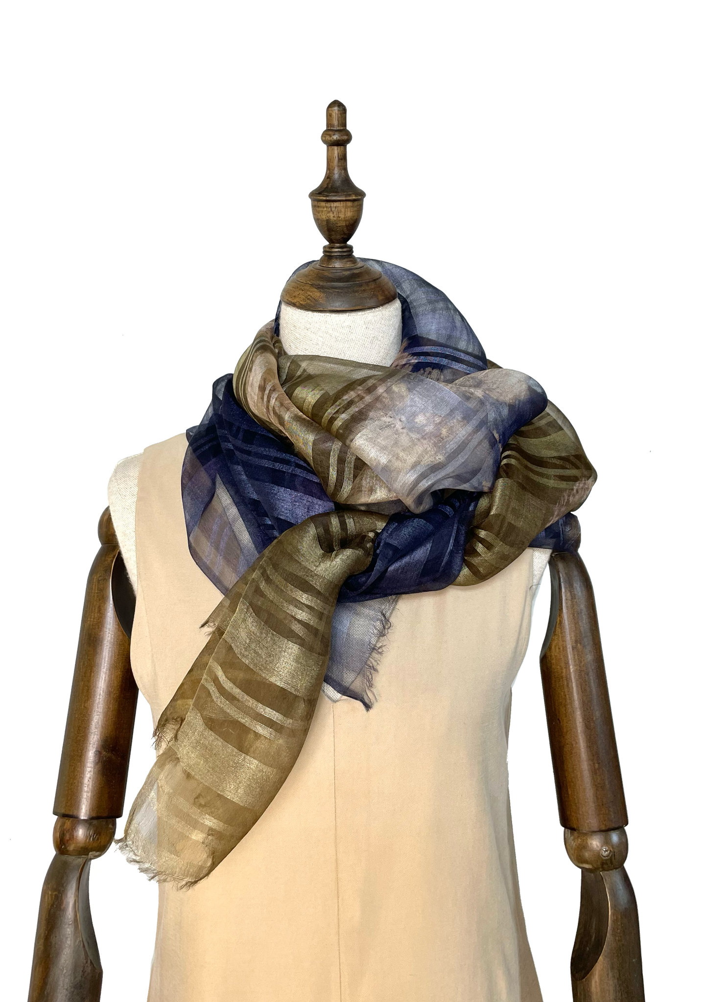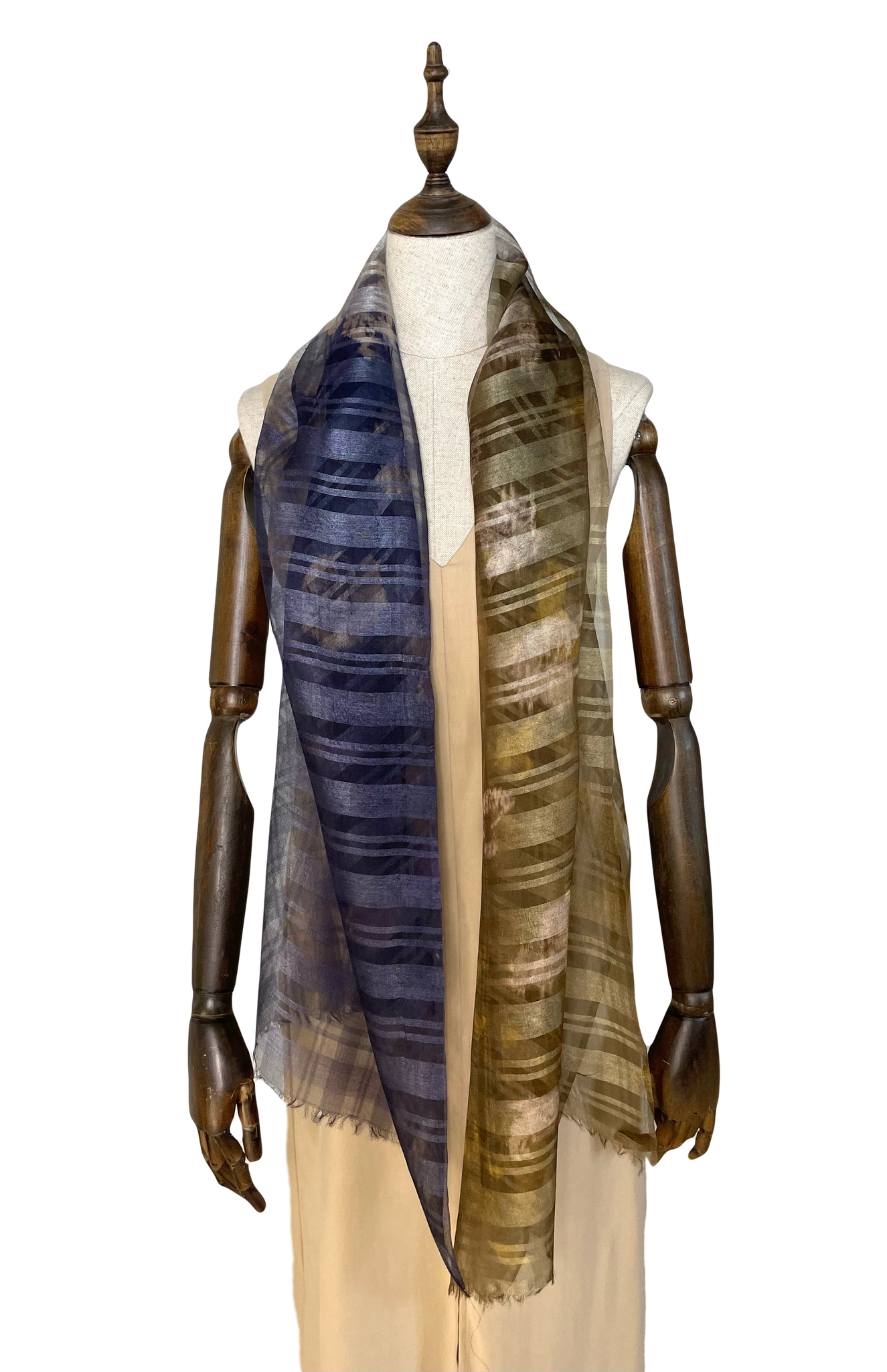 Fular de organza de seda con estampación botánica de hojas de geranio y fondo teñido con palo campeche y extracto de piel de cebolla.