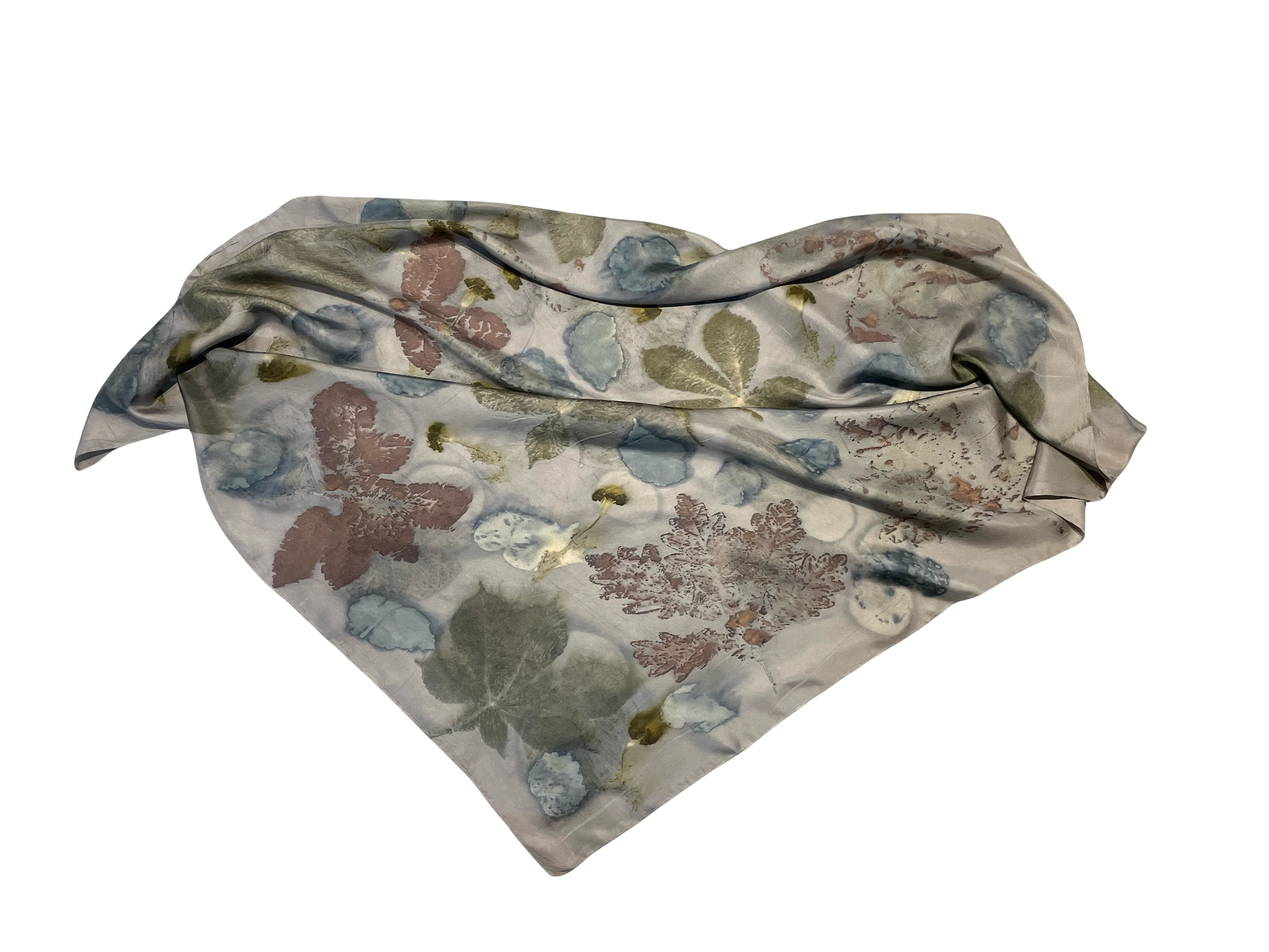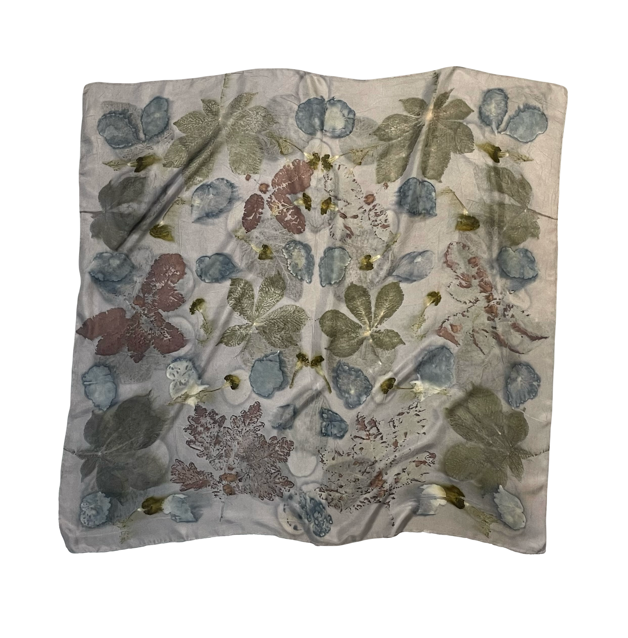 Pañuelo de seda natural con estampación botánica de hojas de castaño de indias, begonia, roble y tagetes. Fondo teñido con palo campeche.